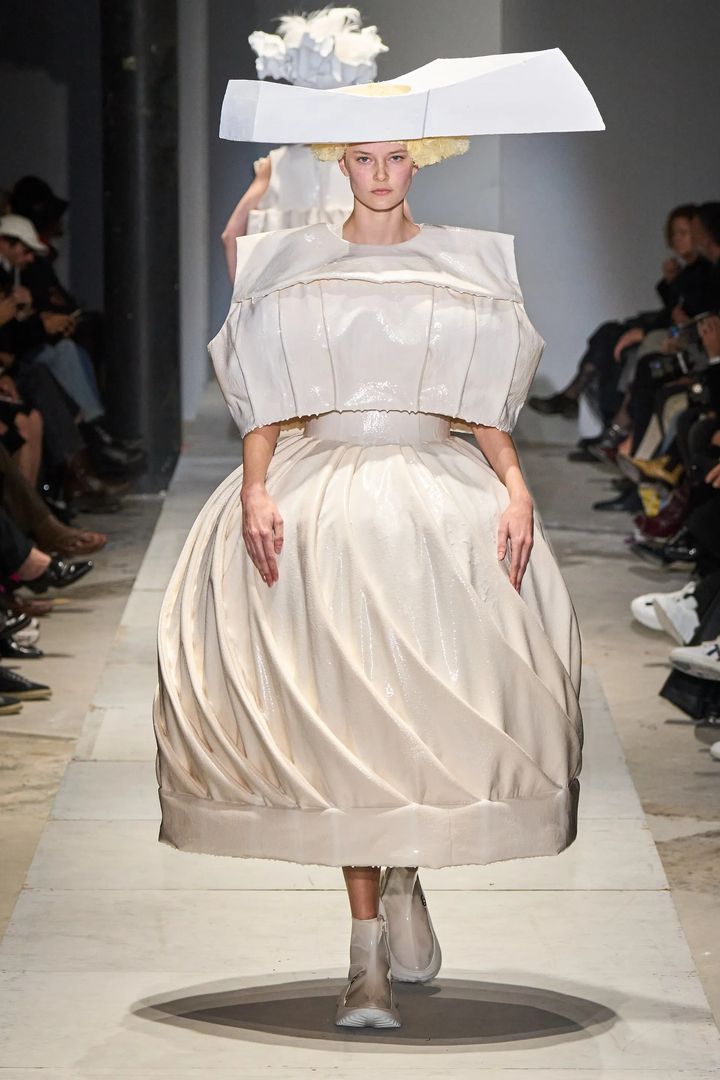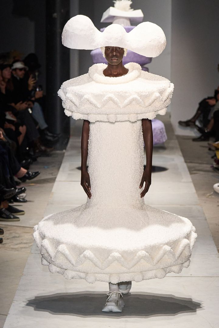 神秘的な音楽が鳴ると、ネズミの耳のようなヘッドピースを付け、ドレスを纏った全身白のモデルがゆっくり歩いてくる。クリームやケーキを思わせるフォルムも。