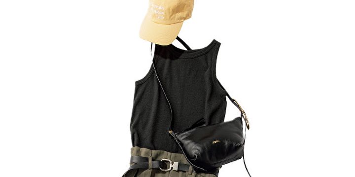 タンクトップ¥6,050(ザ シンゾーン/シンゾーン ルミネ有楽町店)パンツ¥29,700(マルティニーク/マルティニーク ルミネ横浜)キャップ¥7,480(シー/エスストア)ベルト¥13,200(レフィエ/オブリオ)バッグ¥155,100(イザベル マラン/イザベル マラン 青山店)スニーカー¥15,400(アディダス/アディダスお客様窓口)