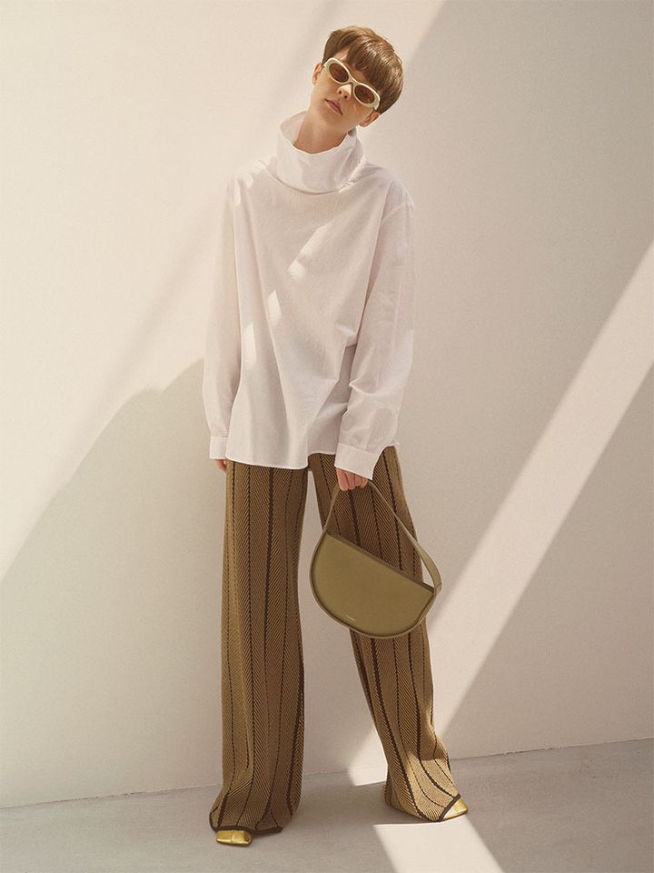 【POINT】スタンドカラーの白シャツは、ゆるめで選ぶとロンT感覚の心地よさ。脱力した上下をゆるませないために、足元はゴールドで飾りさりげないキレを。