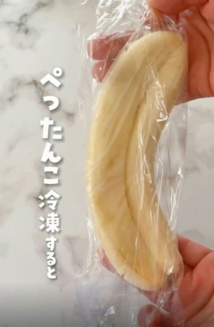 画像のようにぺったんこになったバナナは、ラップに包んだまま冷凍庫へ保存します。