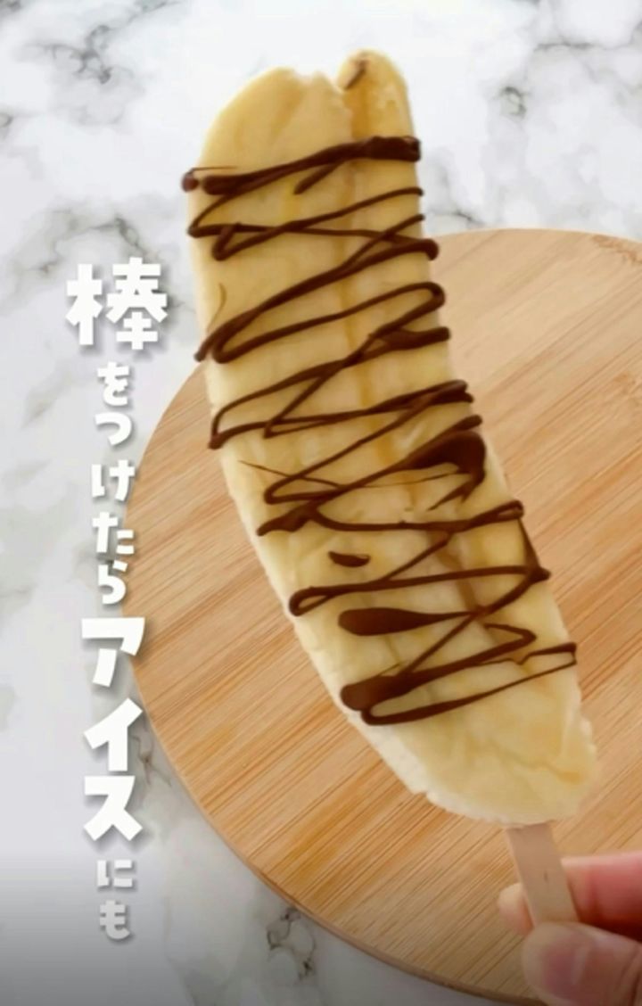 潰したバナナに棒を付けてから冷凍すると、バナナアイスに大変身します。100パーセントバナナのバナナアイス、とてもヘルシーでおいしそうですね。チョコレートを掛けると、より一層リッチな印象ですよね。小腹が空いたときにもおすすめです。