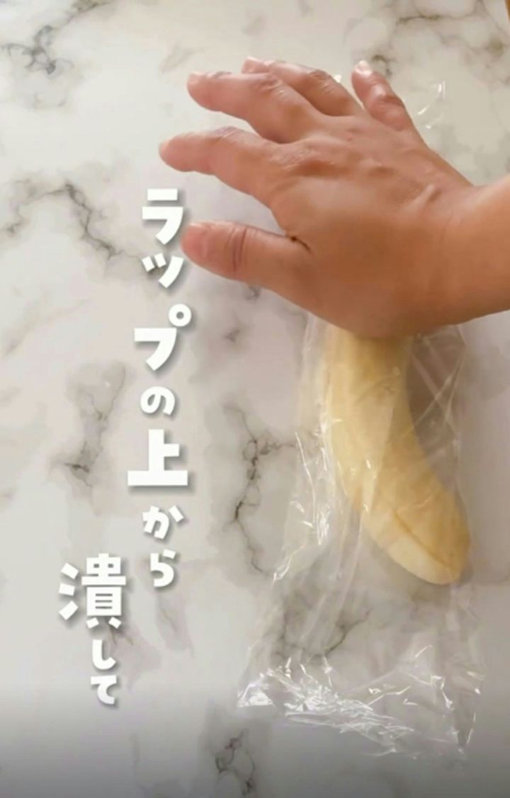 その上から、手の平でラップ越しに「ギュッと一押し」バナナを潰します。平らになるようにしてください。