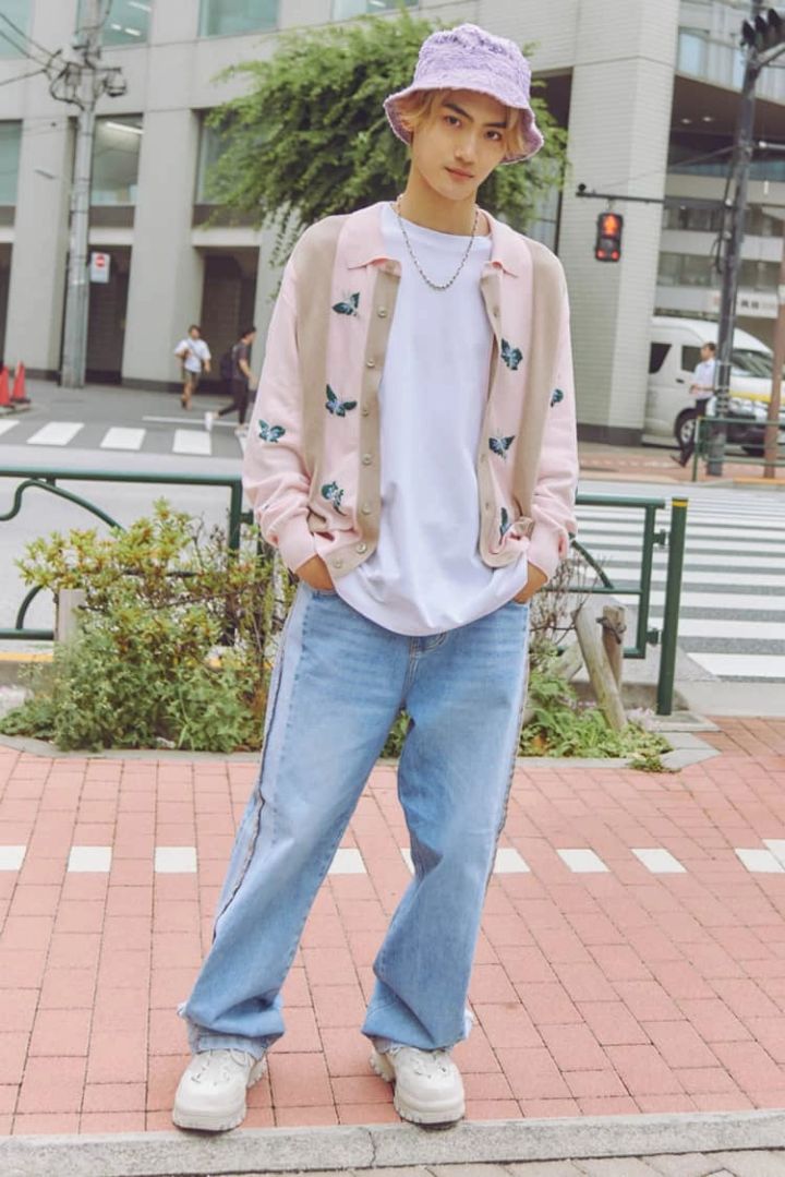 カーディガン 29,700円/フラグスタフ Tシャツ 1,990円/ユニクロ ユー(UNIQLO) パンツ 29,700円/エイチ.ユニット ハット 15,400円/ジャンピエール(ADONUST) ネックレス 27,500円/バフ スニーカー 17,600円/アンブロ(デサントジャパン)