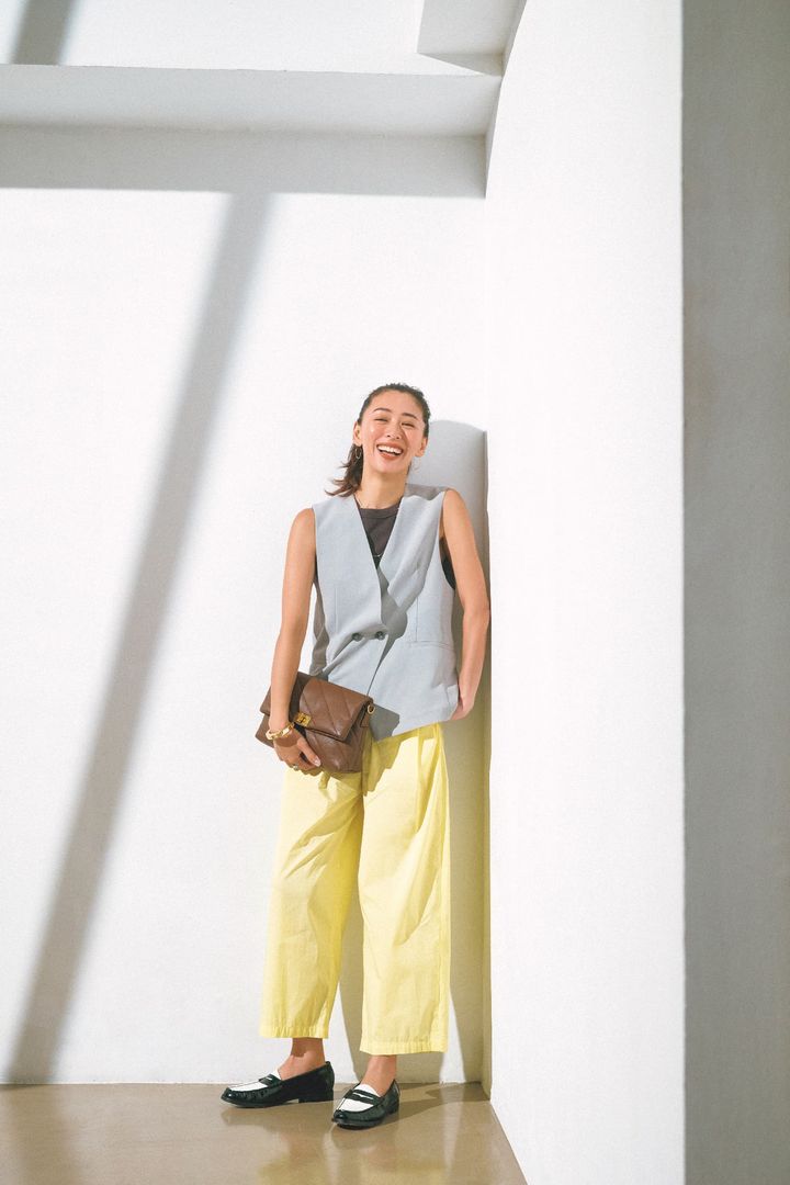 ジレ¥22,990(リフレクト/ワールド プレスインフォメーション)タンクトップ¥7,700(オニット × シップス/シップス インフォメーションセンター)パンツ¥16,940(ルージュ・ヴィフ/ルージュ・ヴィフ ラクレ ルミネ有楽町店)バッグ¥17,050ローファー¥29,700(ともにダイアナ/ダイアナ 銀座本店)ピアス¥58,300ロングネックレス¥154,000ネックレス¥140,800リング¥306,900(すべてマリハ)バングル¥28,600(ワンエーアールバイウノアエレ/ウノアエレ ジャパン)