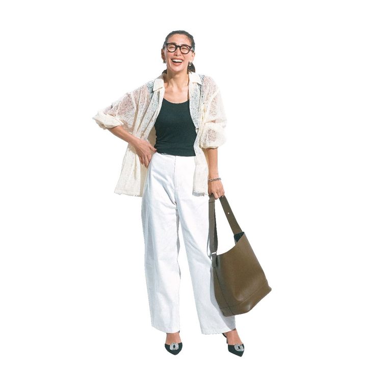 シャツ¥39,600(ジェーン スミス/プラージュ 代官山店)ブラトップ〔吸湿、放湿、速乾〕¥2,200(アセドロン/グンゼ)パンツ¥12,100(マルゥ ユナイテッドアローズ/ユナイテッドアローズ カスタマーサービスデスク)バッグ¥22,550(アンドミューク/アマン)パンプス¥39,600〈トニービアンコ〉ピアス※店舗限定¥19,800〈フィリップ オーディベール〉(ともにアンタイトル)ブレスレット¥6,600(エイチアッシュ/フォーティーン ショールーム)メガネ¥42,900(アイヴァン/アイヴァン 東京ギャリー)