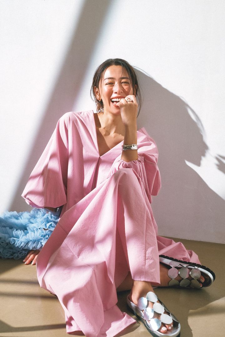 ワンピース※共布ベルト、ペチコート〔接触冷感、透湿性〕付き¥59,400(LE PHIL/LE PHIL NEWoMan 新宿店)バッグ¥6,600(ル タロン/ル タロン 有楽町マルイ店)サンダル¥101,200(ピエール アルディ/ピエール アルディ 東京)ピアス¥23,100(ウノアエレシルバーコレクション/ウノアエレ ジャパン)バングル¥1,870(アネモネ/サンポークリエイト)リング¥17,160(バルブス/ZUTTOHOLIC)