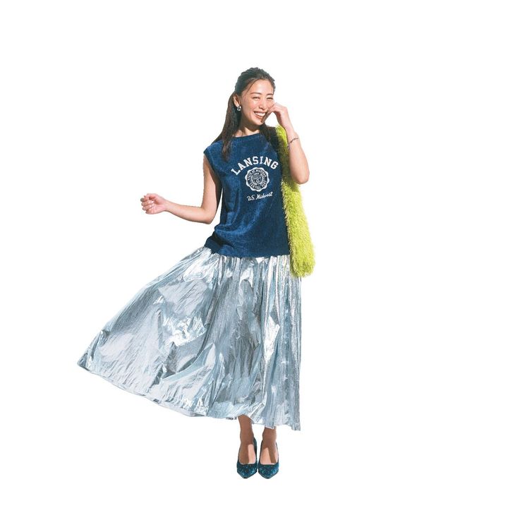 存在感のあるメタリックなシルバースカートで、今っぽくシルエットも綺麗に!インしないゆったりとした着こなしで過ごしやすさ○。二の腕が気になるなら、シースルーtシャツや長袖でもOK!寒暖差のある季節には、ハオリものを合わせても良いかも。