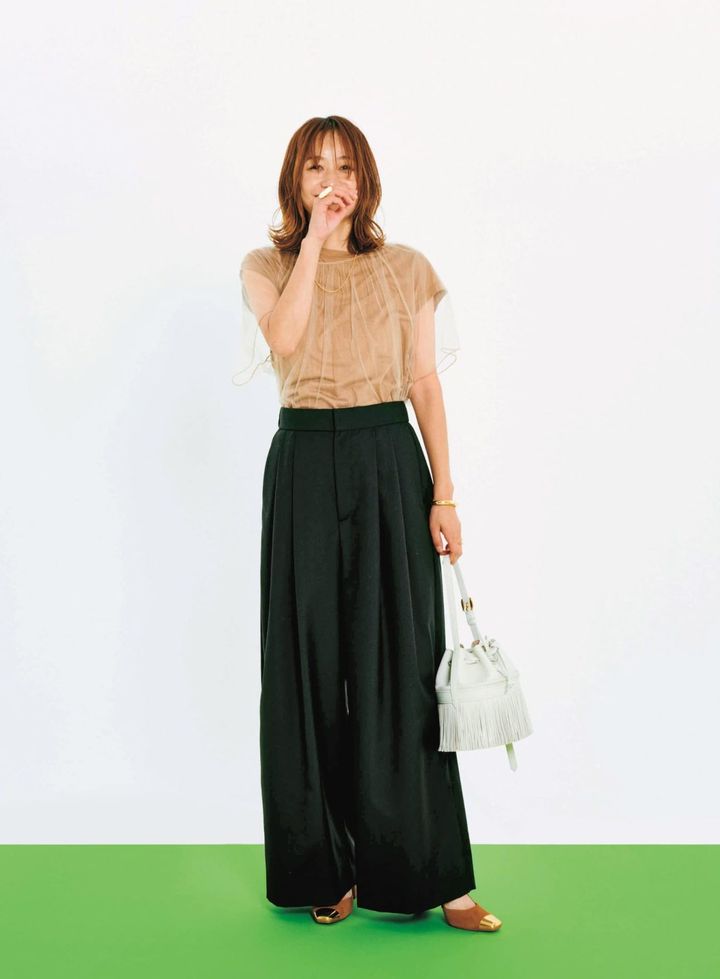 パンツ¥46,200(エイトン/エイトン青山)ブラウス¥14,300〈ガリャルダガランテ〉パンプス¥115,500〈マリア ルカ〉(ともにガリャルダガランテ 青山店)Tシャツ¥9,350(カオス/カオス丸の内)バッグ¥148,500(J&M デヴィッドソン/J&M デヴィッドソン カスタマーセンター)ネックレス¥70,400(ハイク/ボウルズ)バングル¥25,300(ワンエーアールバイウノアエレ/ウノアエレ)ダブルフィンガーリング¥36,300リング¥47,300(ともにリューク)