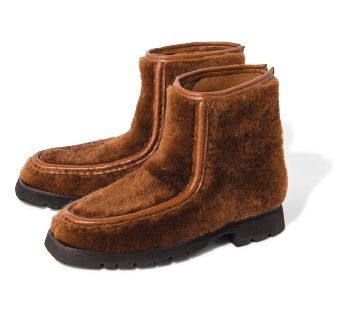 見た目も履き心地も暖かい上質なシープスキンを使用したムートンブーツ。ラバーソールで滑りにくく、バックジップ式で脱ぎ履きもスムーズ。¥108,900(へリュー/ショールーム セッション TEL:03・5464・9975)