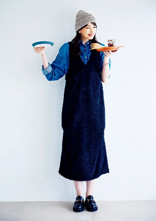デニムシャツ¥18,700/アルページュストーリー 黒セットワンピース(ワンピース)¥29,700/emmi(エミ ニュウマン 新宿店) ローファー¥33,000/銀座かねまつ(銀座かねまつ6丁目本店) ニットキャップ¥4,400/リエル リシェ パールイヤリング¥4,180/ミミ33(サンポークリエイト) 3連ブレス¥19,800/フィリップ オーディベール(アンタイトル)