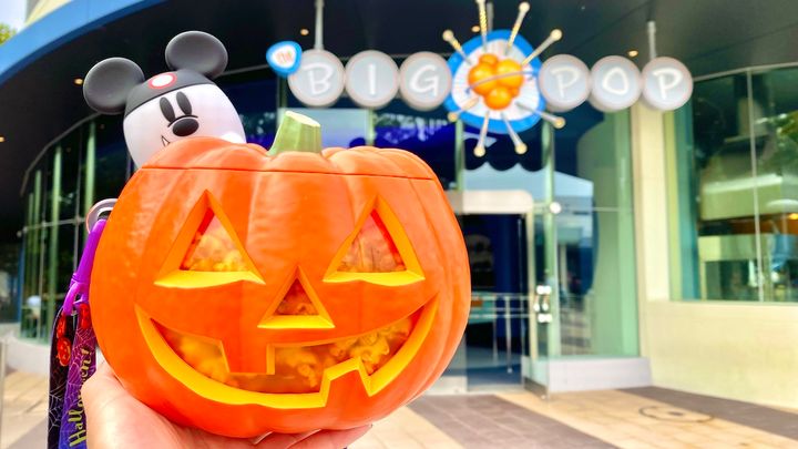 カボチャの形のポップコーンバケットは、スイッチを入れると光り、ハロウィーン気分が倍増! ちょこんとのったゴーストは、ぷにぷに触感でつい触ってしまいますよ。