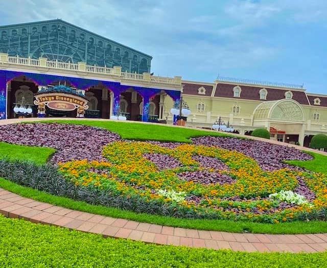 お出迎えしてくれるのは、ヴァンパイアに仮装したミッキーデザインの花壇!