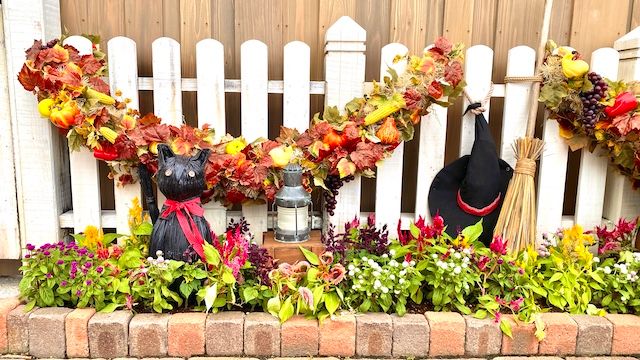 カボチャのかかしや黒猫、カボチャなど、ストーリーを感じるフォトスポットがいい感じです。