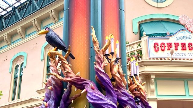 ワールドバザールのメインストリートは、パーティーをイメージさせるドレープで飾られています。イバラの上にマレフィセントの配下であるカラス・ディアブロらしき鳥を発見!