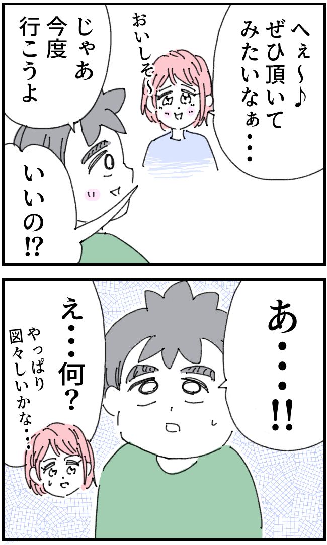 話しを聞いて「へぇ~。ぜひ頂いて見たいなぁ」とかおりさんが呟くと、「じゃあ今度行こうよ」といちろうさんが言いました。しかし、すぐに「あ・・・!!」と気まずそうな表情を浮かべたいちろうさんに「え、何?やっぱり図々しいかな」と戸惑うかおりさん。