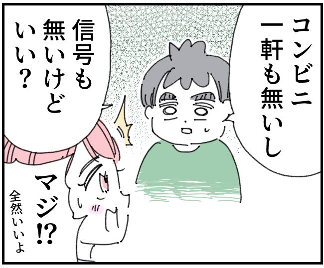すると、いちろうさんは「コンビニ一軒も無いし、信号も無いけどいい?」と心配そうに言いました。かおりさんは驚きつつも「マジ!?全然いいよ」と答えました。