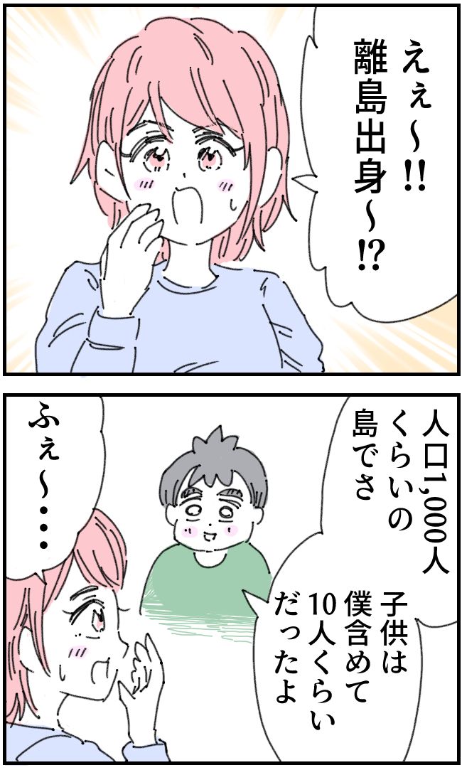 離島出身だと聞き驚くかおりさんに、いちろうさんは「人口1,000人くらいの島でさ、子供は僕含めて10人くらいだったよ」と育った環境を話しました。