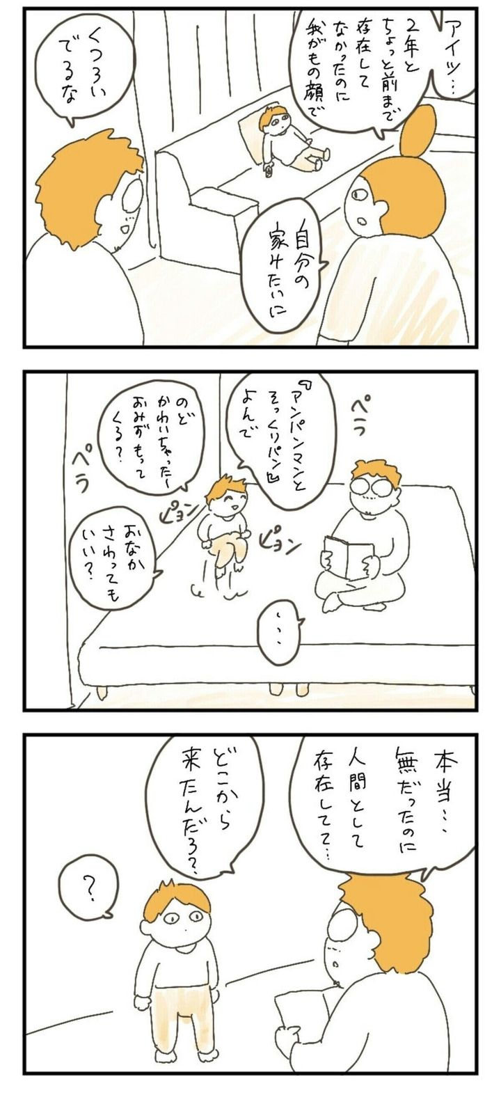 おでん君は2歳。当然、2年前はこの世には存在していませんでした。それが今では元気にコウイチさん夫婦の元で生活をしています。おでん君がいることが当たり前になっていたけど、よく考えてみると2年前までおでん君は影も形もない存在。この光景をふと不思議に思ったコウイチさん夫婦。このような不思議な感覚に共感できる人もきっといるでしょう。どうぞお読みください。