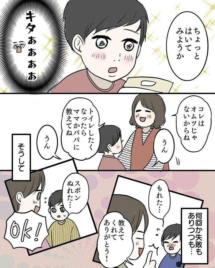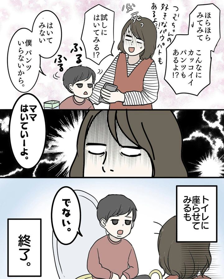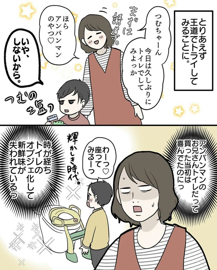 子どものトイレトレーニングは苦労する方もいるでしょう。にしみつ(つむママ)(@tumumama_ikuji)さんもさまざまな方法で息子・つむちゃんのトイレトレーニングを行いますが、スムーズにいきません。しかしあるアイテムでつむちゃんのやる気スイッチが入り…。その気になるアイテムとは何なのでしょうか。