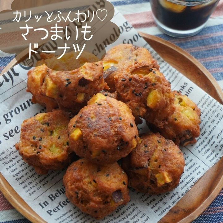 外側はカリカリ、中はふわふわ食感のさつまいもドーナツ。さつまいもに下味をつけることで、おいしく仕上がりますよ。