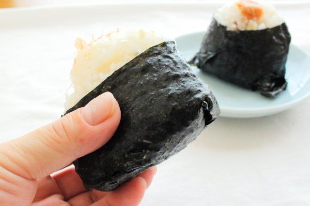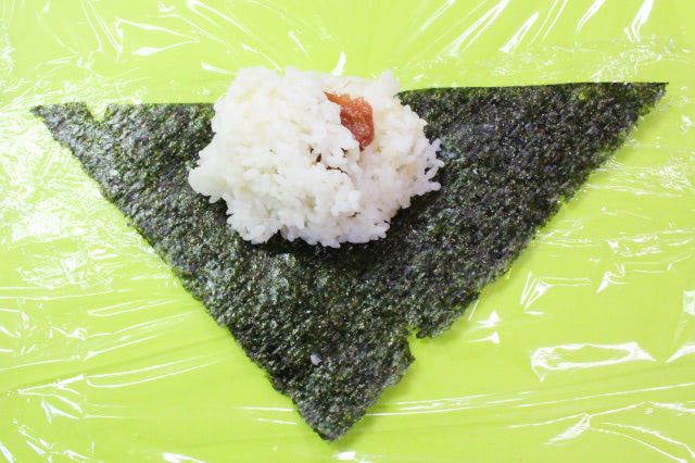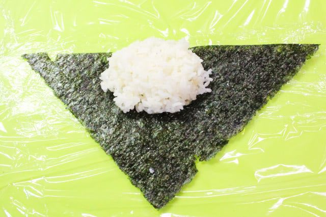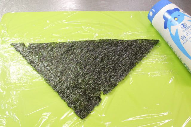 焼きのりを逆三角形に置くことで、ご飯をしっかりと包めるそうです。
