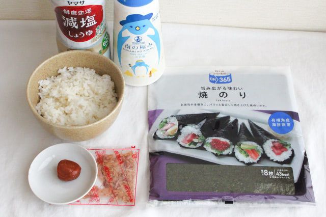 おにぎりの具はお好きなものをご用意くださいね。今回は梅干しとおかかしょうゆで作ってみます。