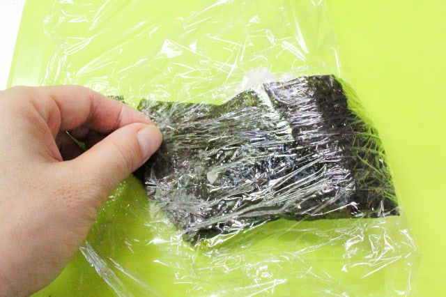 6. 左右のラップを持ち上げ、左右の焼きのりもご飯に貼り付けます。
