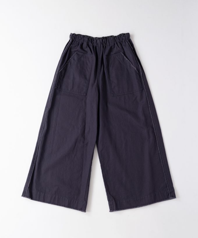 コットンヘリンボン素材のワイドパンツ。前についた大きなポケットと、裾やサイドが裁ち切りデザインになっているのがポイント。ヘリンボン生地を使用することで、ひと味違った雰囲気を楽しめます。