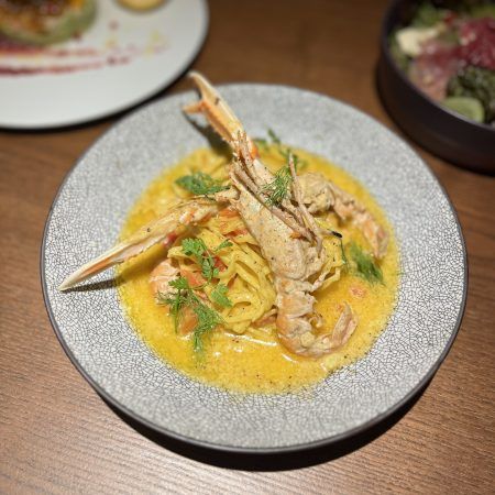 乾麺、グルテンフリースパゲッティ、+300円で自家製手打ちパスタも選べる「手長海老とフレッシュトマトのブランデークリームソース」(コースは+700円)は、香ばしく焼いてブランデーでフランベした手長海老のコクと香りがたまりません!フレッシュなトマトが入った爽やかなクリームソースをたっぷり絡めていただきます。