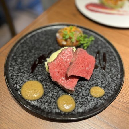 お腹が空いていて、がっつり食べたい日には、「鹿児島県産 黒毛和牛のロースト」はいかが。(コースは+1,000円)A5等級の鹿児島県産黒毛和牛のランプ、もしくはイチボを低温調理でミディアムレアに仕上げたメイン料理です。塩昆布の特製ソースがお肉によく合いました。私が伺った日はイチボのローストでした!