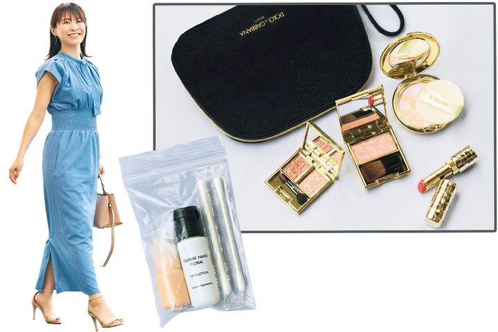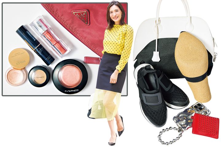 見かけよりたくさん入るエルメスのボリードには、移動用のらくちんシューズや日焼け対策のつば広帽を忍ばせています。仕事柄美にストイックな人に会うことが多いので、クレ・ド・ポーボーテのコンシーラーや、ティルティルのティントでヨレを補整し、身だしなみを。華やかなドットのトップスはバレンティノで購入。