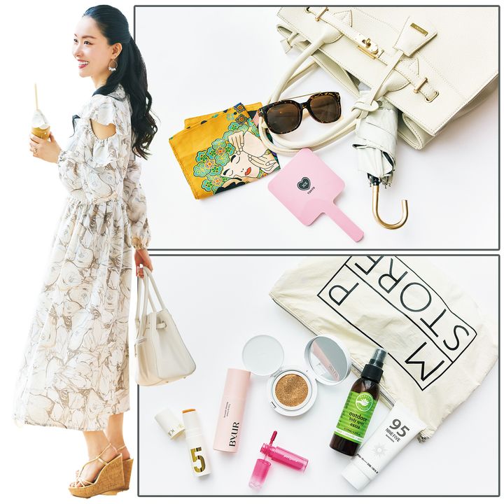 バッグには日傘とサングラス、ポーチをイン。95のUV、OROCHEのマルチバーム、バイユアのファンデなどスキンケア効果が高い韓国コスメが透明感の源。Perfect Potionのボディスプレーは虫よけになる優れものです。腕のチラ見せが清涼感あるワンピはアズノゥアズで購入。