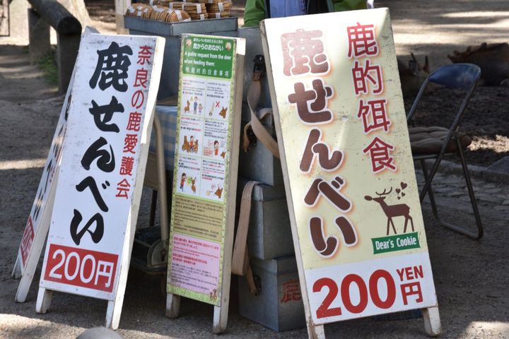 鹿とお近づきになるためのマスト・アイテム「鹿せんべい」は、奈良公園内のあちらこちらで販売しています。鹿は賢いので、購入するとすぐに「あの人!」とピンポイントで近づいてきます。鹿せんべいをねだられたら、すぐにあげてくださいね。特に出産期(5~7月)や発情期(9~11月)は鹿の気が荒くなっているので、じらすと体当たりしてくることもありキケンです。そして、鹿せんべい以外の食べ物は絶対にあげないことが、鹿と人とのお約束。