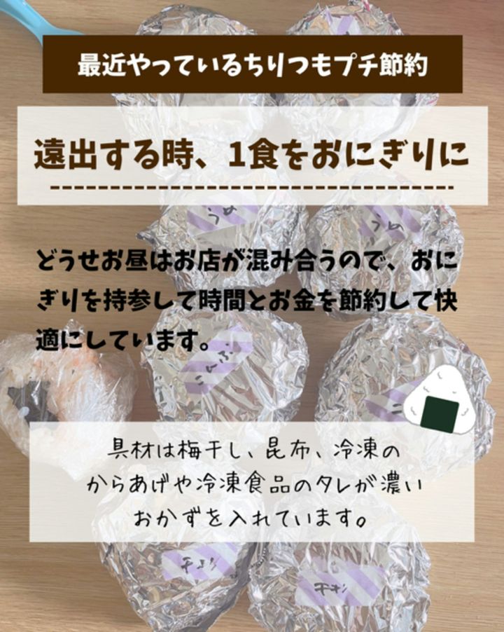 おにぎりの具材は家にあるもので作ります。わが家の場合は、家族が好きな梅干し、昆布の佃煮、鮭フレーク、冷凍のからあげなどが定番です。お昼代の節約とおなかが空いた時にすぐに食べられるので家族みんなのストレスが減りました。