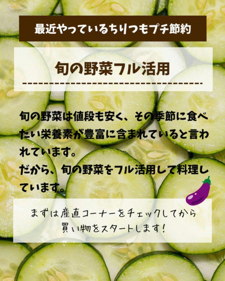 スーパーに併設されている産直コーナーは節約の味方。旬の野菜は価格が安いことが多く、その季節に食べたい栄養素が野菜には豊富に含まれていると言われています。
