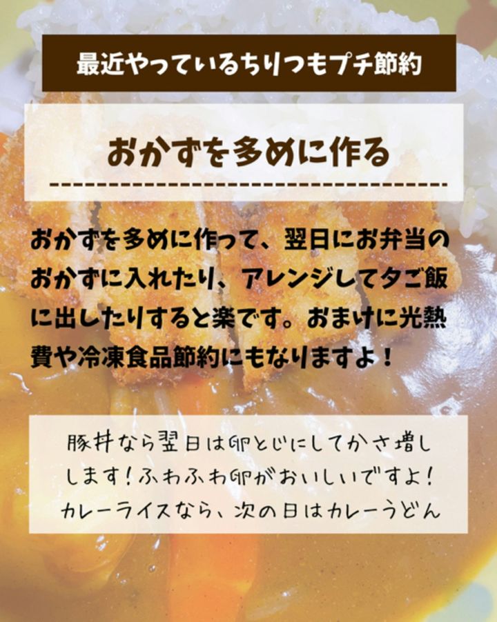おかずを多めに作って、翌日にお弁当のおかずに入れたり、アレンジして夕ご飯に出したりすると手間が減って楽になります。おまけに、光熱費の節約や冷凍食品を買わなくてよくなります。