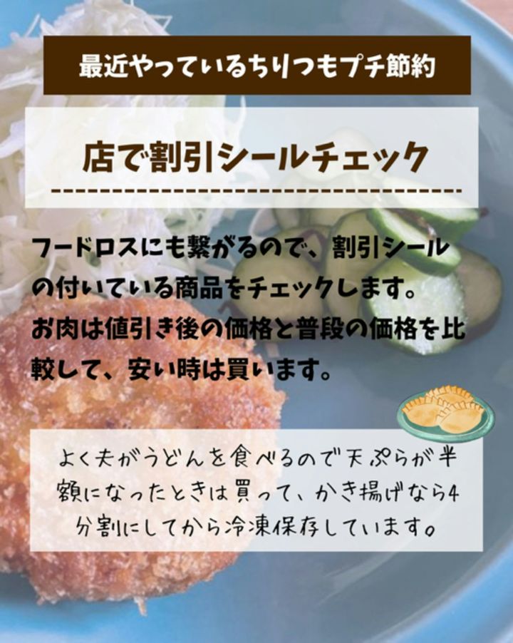 お店では割引シールをチェックするようにしています。フードロスにもつながるので、割引シールがついている商品を積極的に購入しています。お肉は値引き後の価格と普段の価格を比較して、安い時に買います。なかには、値引きはしているものの普段より高めに設定されていると感じたこともあります。