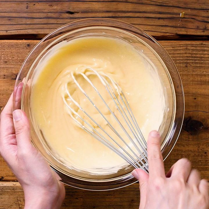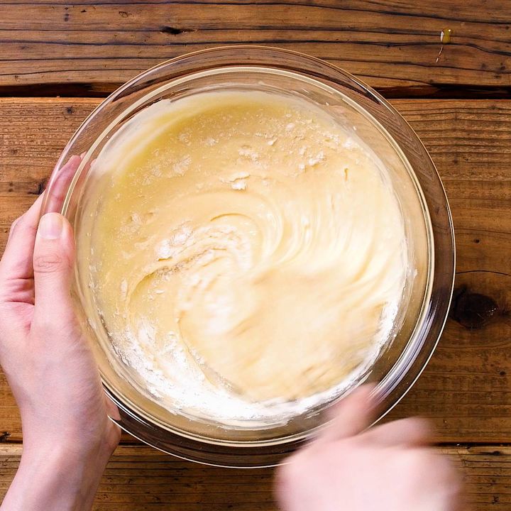 4: 卵を2〜3回に分けて加えて、その都度よく混ぜます。