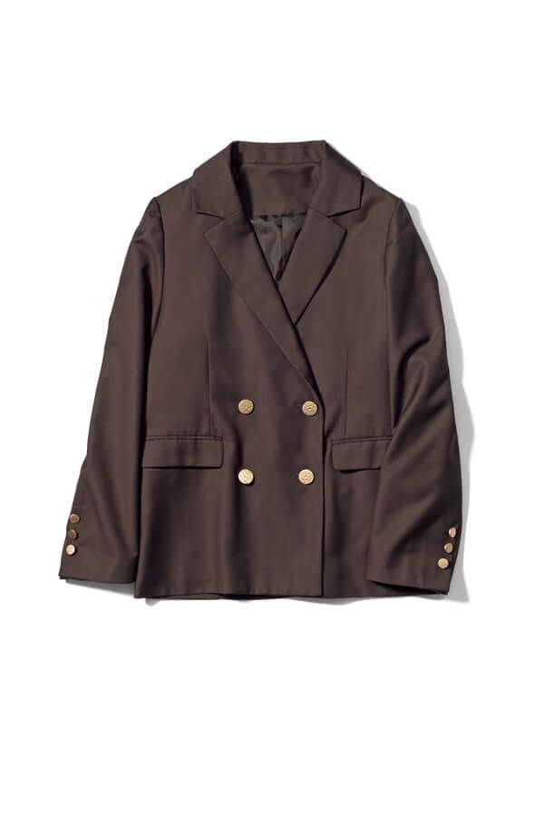 シンプルなジャケットも、旬カラーに映える金釦がアクセントに♪ こっくりブラウンで秋っぽスタイルを確立して。
