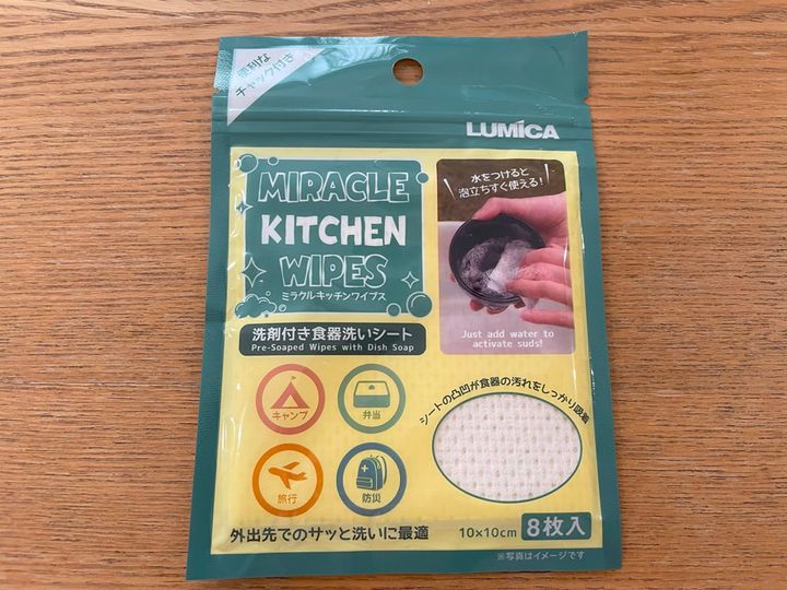 洗剤付きの食器洗いシートで、水で濡らすと洗剤が泡立って、食器を洗うことができるアイテムです。