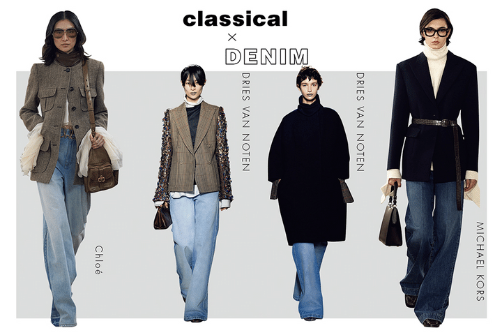 デニムは引き続きワイドシルエットが主役。ポイントは「着方」。王道ジャケットとの合わせなど、直球カジュアルなアイテムほど「きちんと着る」ことが今っぽさにつながる。