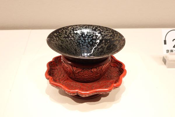 はじめに展示されていたのは、重要文化財《油滴天目 附:堆朱花卉天目台》(中国・建窯)。堂々たる風格を感じさせる名品です。 「朝顔のように開いた」茶碗の底から口縁まで大ぶりの油滴斑が飛び散るように広がっています。 銀色の斑紋に青や金の光沢を帯びた油滴が、黒釉の茶碗の内から外へびっしりと浮き出る姿に圧倒されました。