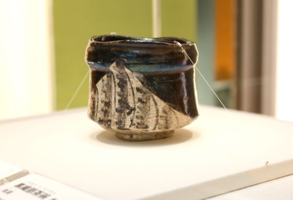 「口を三方から歪めた半筒形の茶碗」で、胴の片面に「漆黒の鉄釉を三角に掛け外し、網干風の文様が鬼板と呼ばれる鉄絵具で」描かれています。 もう一面の「黒釉を掻き落として白釉を塗り三角繋ぎを表した部分」を午睡する漁師に見立てたのが銘「うたたね」の由来だそうです。