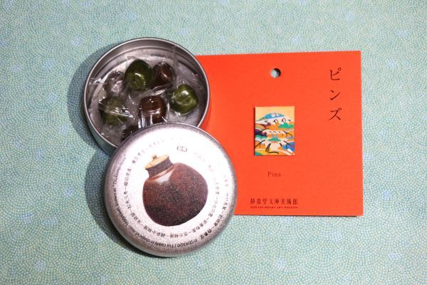 ミュージアムグッズは、缶入りキャンディ 付藻茄子(770円)、ピンズ 絵手鑑 羽子板の飾絵(800円)を購入。 缶入りキャンディ 付藻茄子は、ほうじ茶飴と抹茶飴の味です。