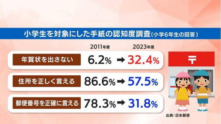 日本郵便が全国の小学生を対象に行った調査では、年賀はがきを1通も出さないという小学6年生は2011年度は6.2%だったのに対し、2023年度では32.4%に!
