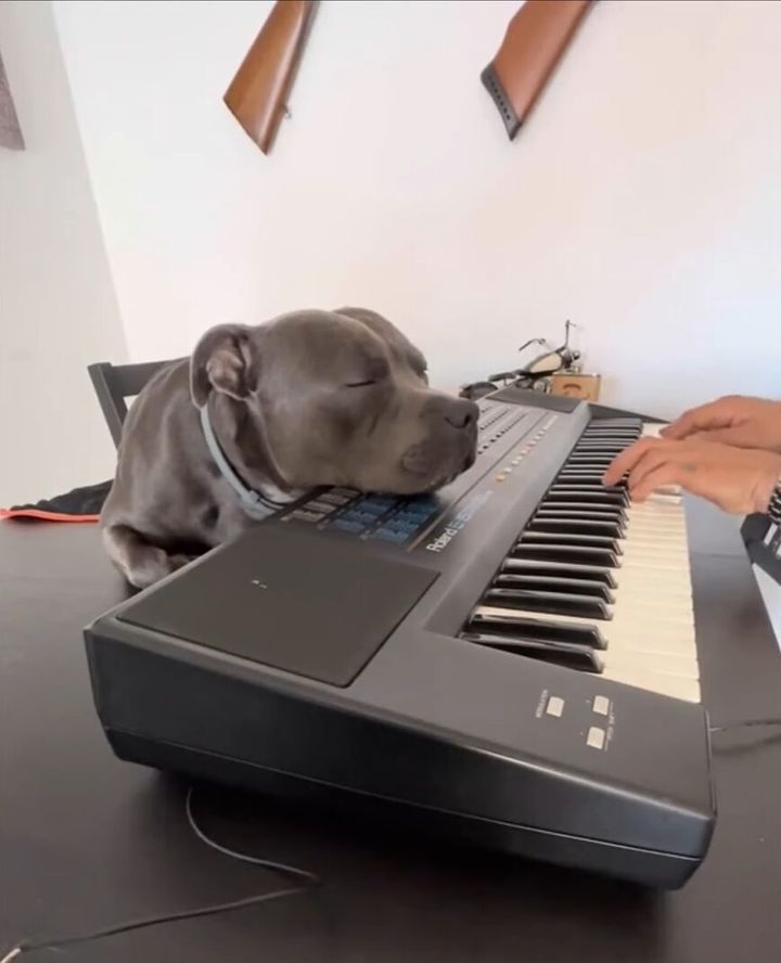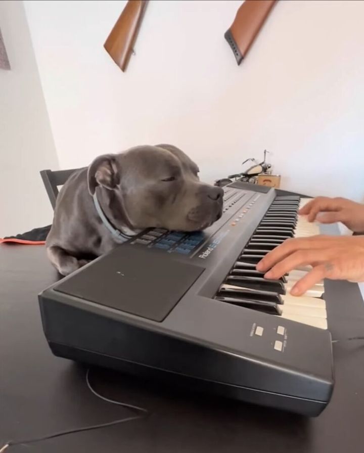 演奏を一番いい場所で聴く愛犬。スタッフォードシャー・ブル・テリアがピアノに頭を乗せてうっとり【海外・動画】