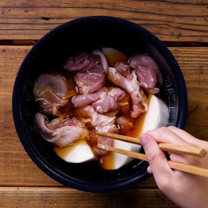 3: 炊飯釜に【煮汁】をいれて混ぜ合わせて、①を並べいれ、②をのせます。