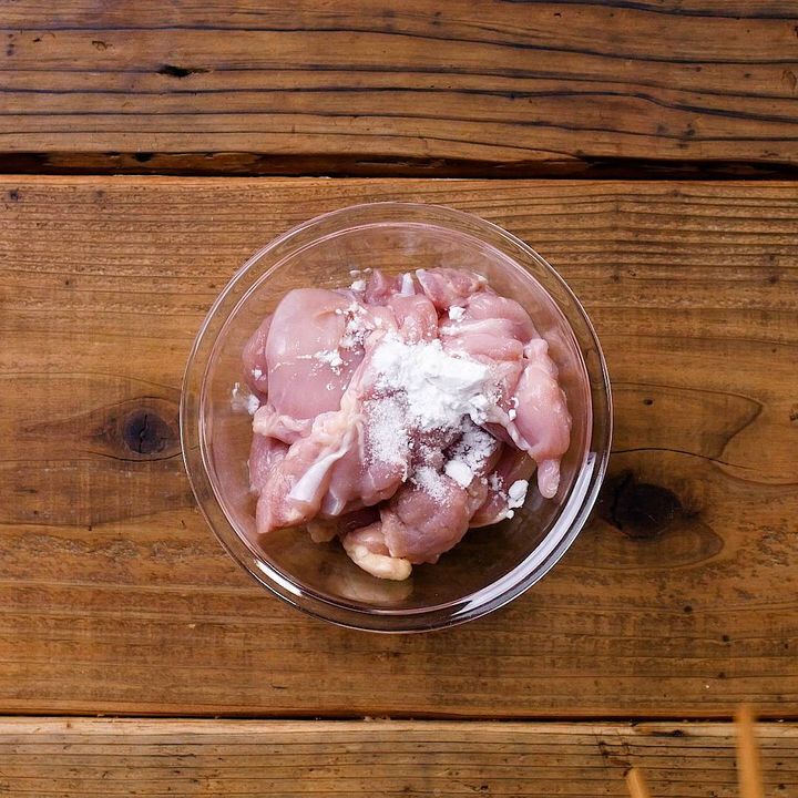 2: 鶏肉に塩、片栗粉を加えて混ぜ合わせます。