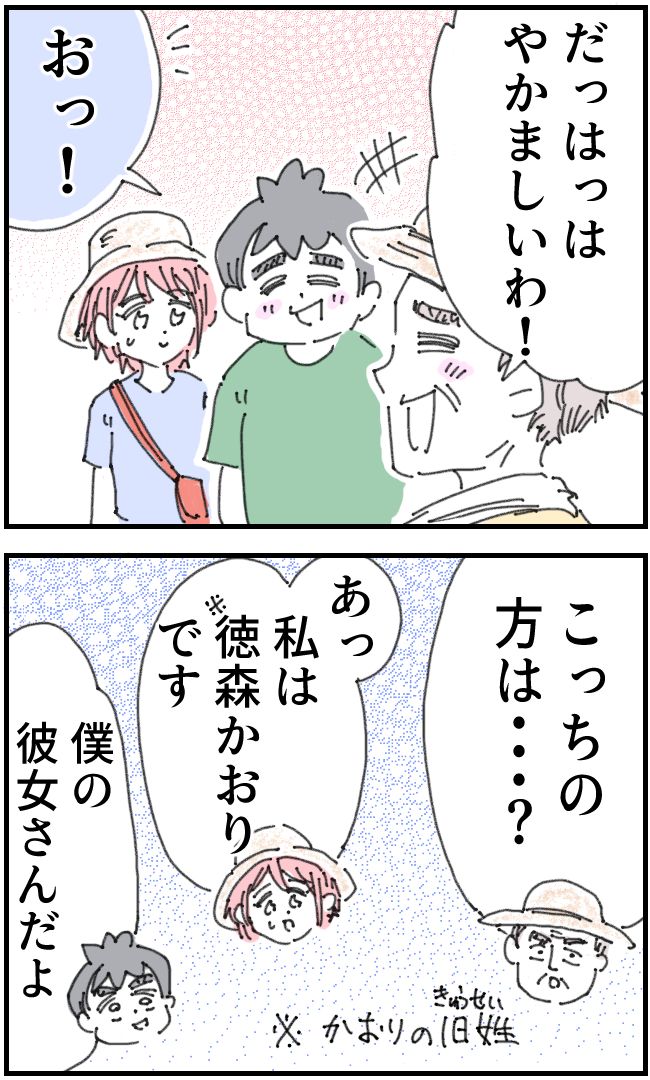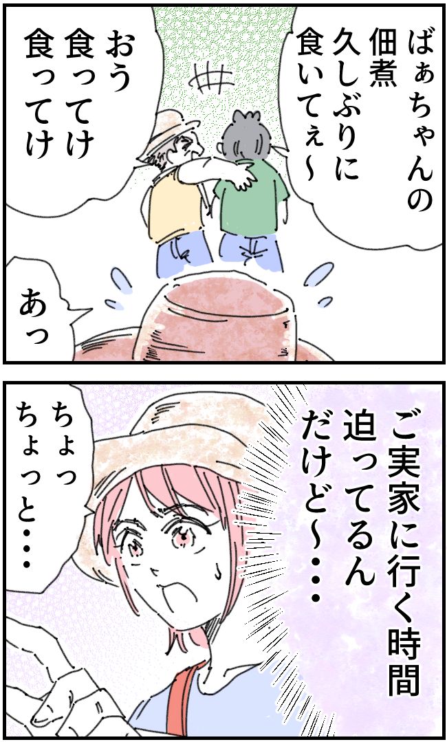 そして「ばぁちゃんの佃煮久しぶりに食いてぇ~」「おう食ってけ食ってけ!」しばじぃさんといちろうさんが盛り上がって話し出し、戸惑うかおりさんは、「ちょっ、ちょっと・・」と実家に行く時間が迫ってるんだけど・・と思いかおりさんは動揺してしまいました。