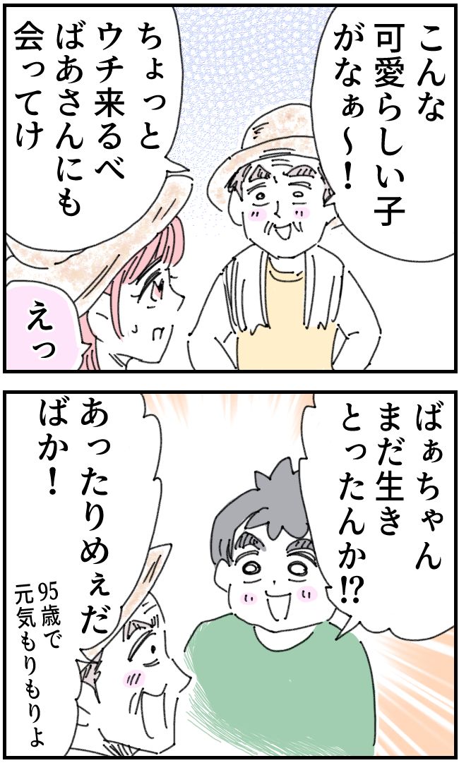 「こんな可愛らしい子がなぁ~!ちょっとウチ来るべ。ばあさんにも会ってけ」突然の出来事に興奮気味のしばじぃさんの言葉に「えっ」と戸惑うかおりさん。すると「ばぁちゃん、まだ生きとったんか!?」とうれしそうに話に加わるいちろうさんに、「あったりめぇだばか!95歳で元気もりもりよ」としばじぃさんも答えます。